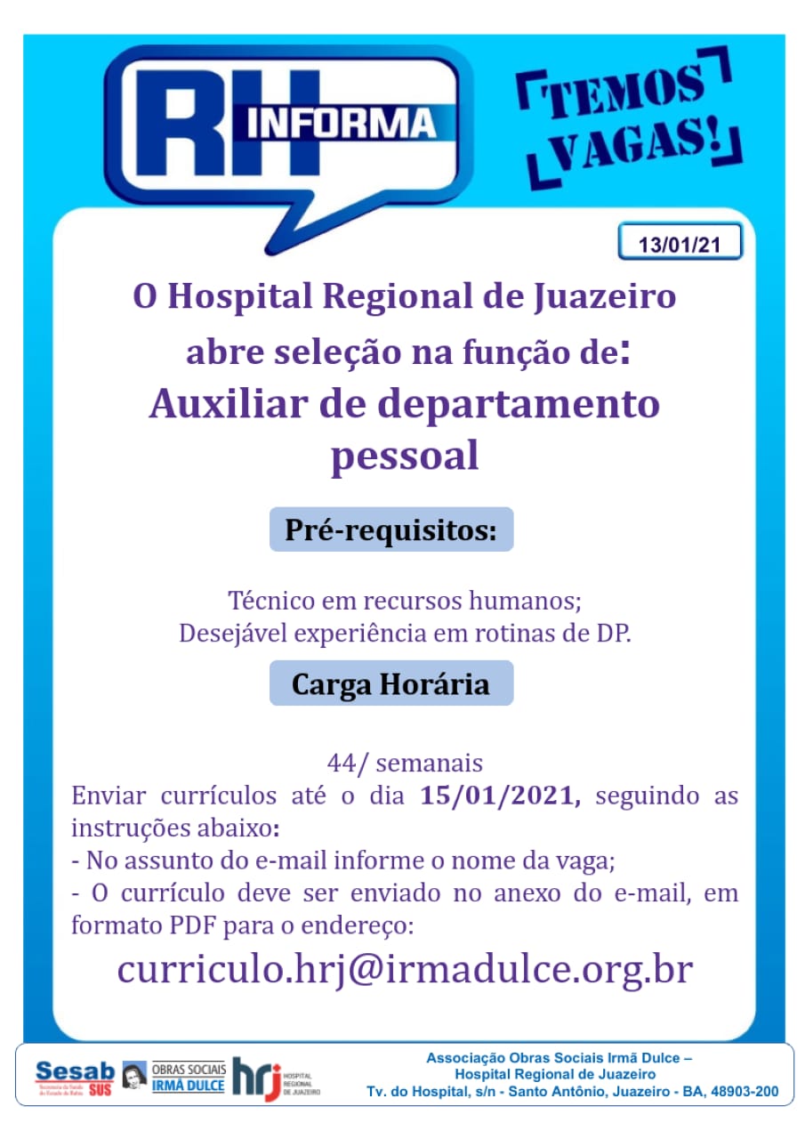 até o dia 15 de janeiro (sexta-feira), através do e-mail curriculo.hrj@irmadulce.org.br, com o anexo do