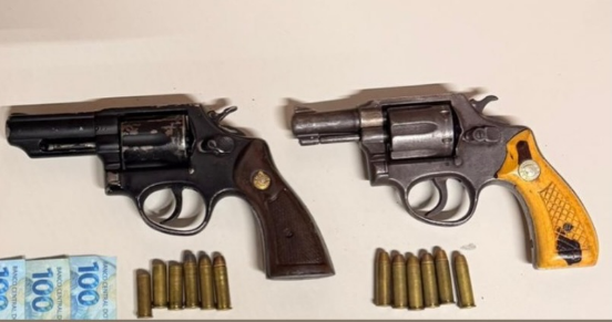 Durante a ocorrência, os policiais apreenderam dois revólveres, sendo um calibre .38 com numeração suprimida, contendo uma munição intacta, duas pinadas e três deflagradas, e outro revólver da marca Taurus, com seis munições intactas. Também foram encontrados um smartphone da marca Samsung, de cor branca, e R$ 600 em dinheiro.